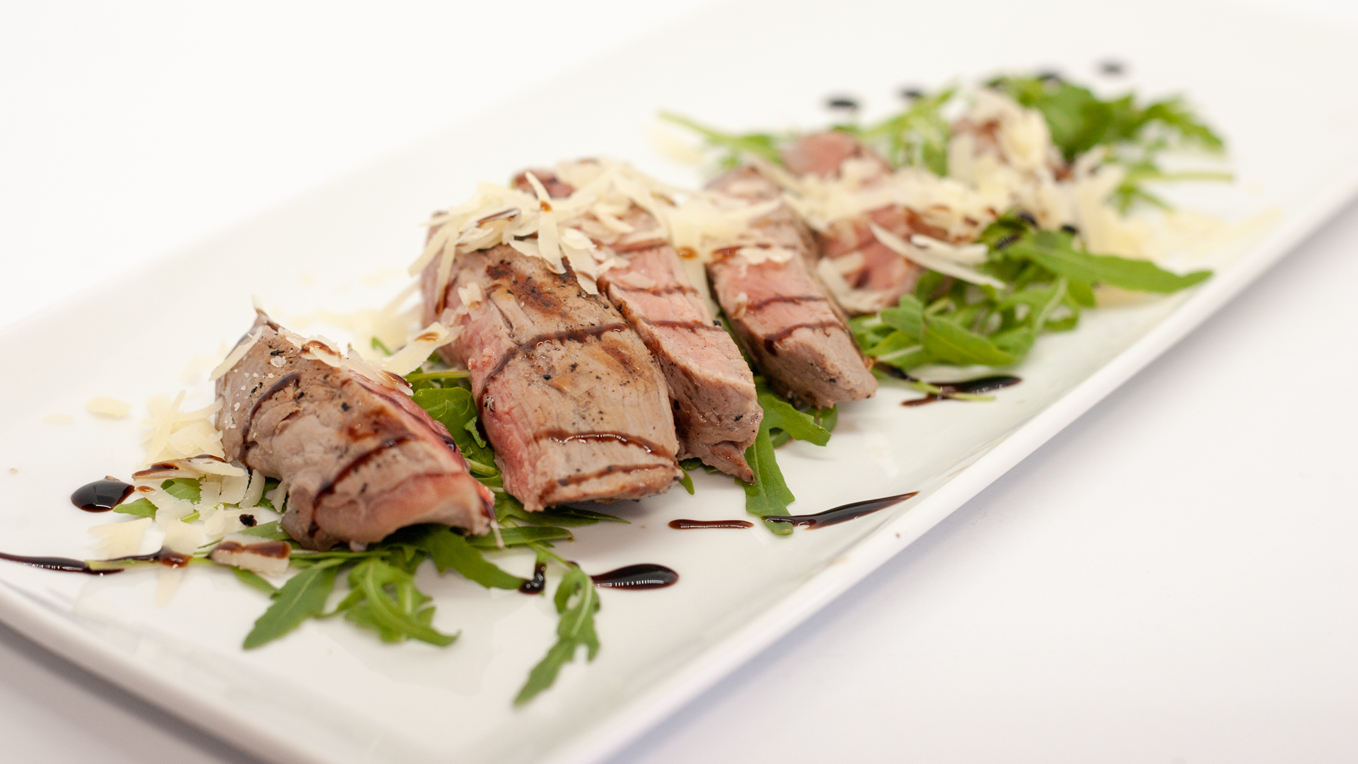 ternera, rúcula, tomate cherry, escamas de parmesano, aceite de oliva virgen extra